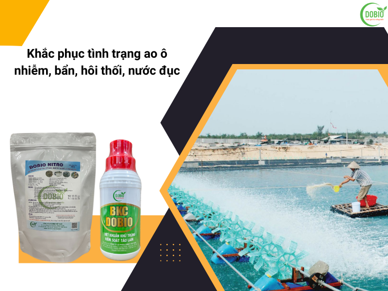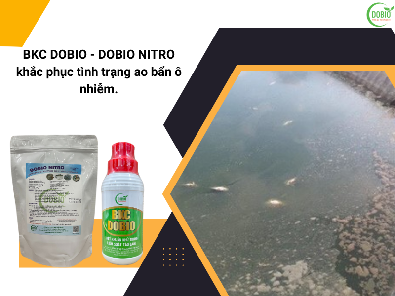 Nước ao bị ô nhiễm hôi thối, bẩn là vấn đề thường gặp ở các hộ chăn nuôi thủy sản. Tình trạng này khiến cho môi trường sống của thủy sản bị ảnh hưởng nghiêm trọng, dẫn đến cá tôm chậm lớn, dễ bị bệnh và thậm chí là chết. Để khắc phục tình trạng này, bà con có thể sử dụng BKC DOBIO và DOBIO NITRO. Đây là hai sản phẩm chế phẩm sinh học được nghiên cứu và sản xuất bởi Công ty DOBIO Việt Nam, có tác dụng hiệu quả trong việc xử lý nước ao bị ô nhiễm.