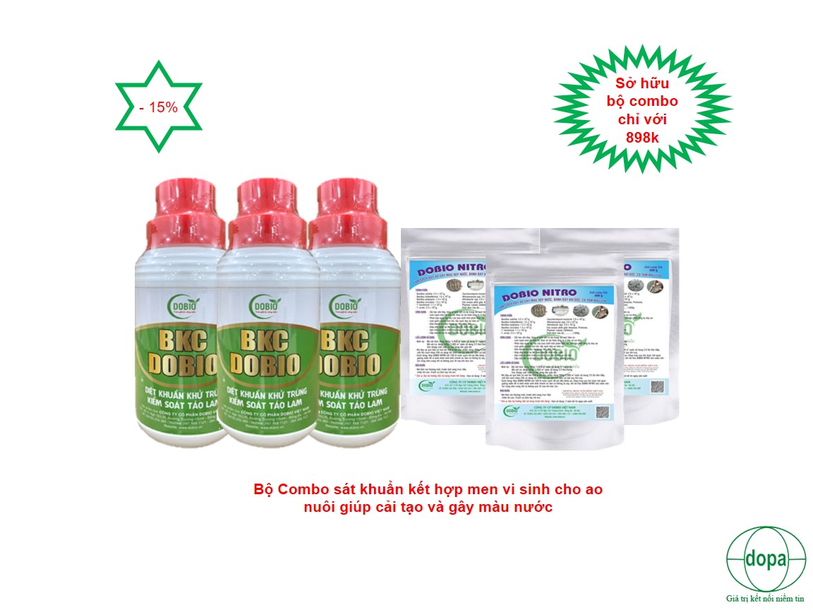 Chú ý: Sau khi bà con sử dụng BKC Dobio để sát khuẩn, các loại vi sinh vật có lợi và vi sinh có hại sẽ cùng bị tiêu diệt. Chính vì vậy bà con cần sử dụng sản phẩm men vi sinh Dobio Nitro đánh kết hợp sau khi ngừng sử dụng sản phẩm sát khuẩn để cải tạo lại màu nước và cải tạo lại hệ vi sinh vật có lợi giúp ao cá của bà con phát triển tự nhiên và mạnh mẽ