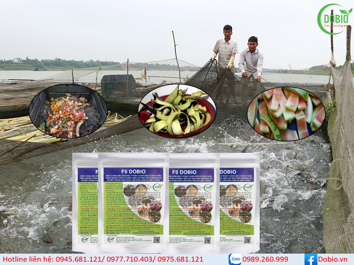 - Sử dụng chế phẩm sinh học F5 Dobio để ủ với các loại rác thải hữu cơ như: rau, củ, quả, vỏ trứng,,,để tạo thành rác hữu cơ sau đó hòa tan ra nước rồi tạt đều hỗn hợp ra xung quanh ao.