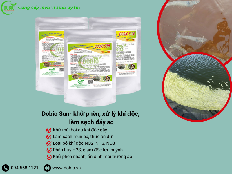 DOBIO SUN là sản phẩm men vi sinh sinh học chuyên xử lý môi trường nước ao nuôi, đặc biệt hiệu quả trong điều kiện ao nhiễm phèn, ô nhiễm khí độc và có lượng mùn bã lớn.